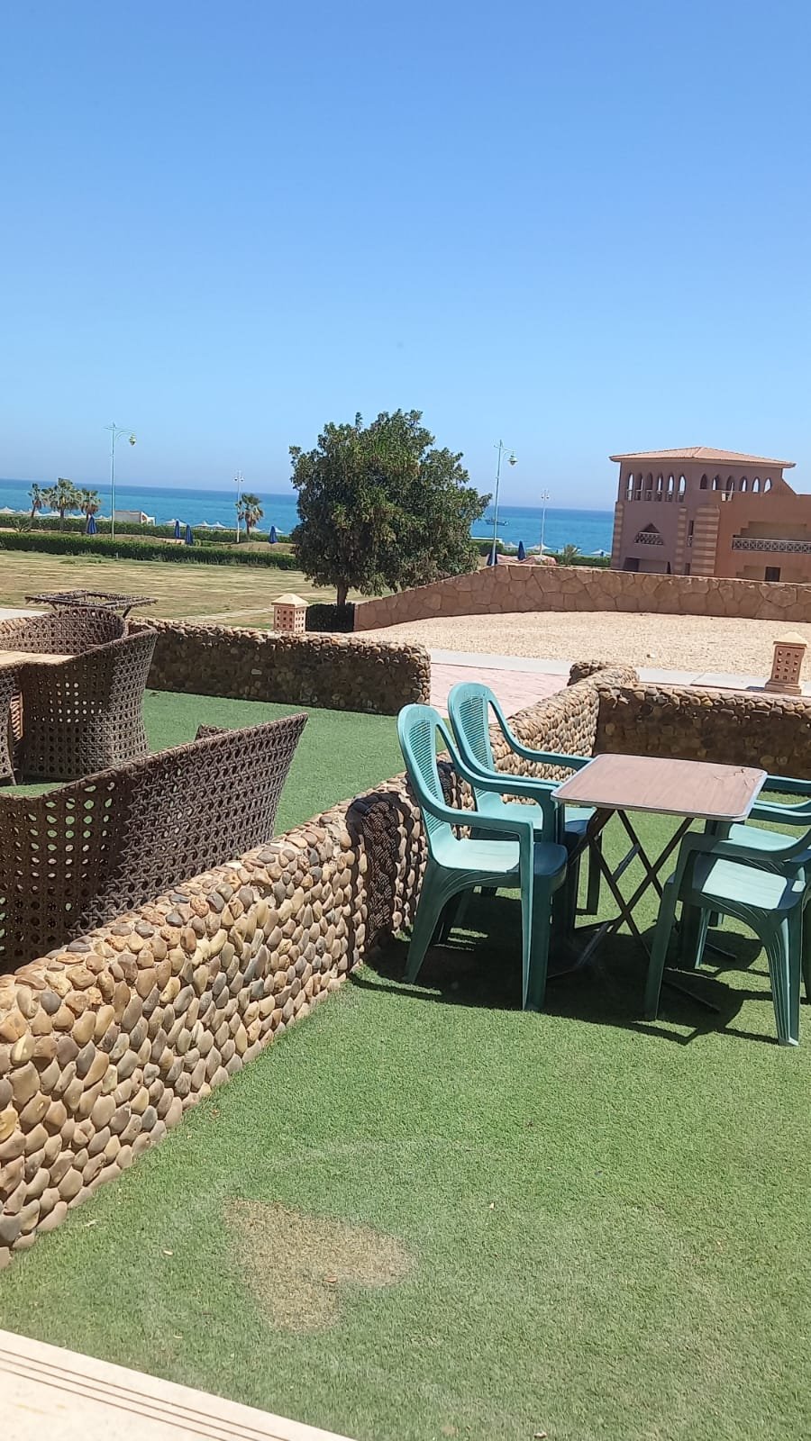 شاليه دور أرضي بجنينة صف تاني على البحر ١ غرفة نوم ريسبشن مكيف فيه صوفا تتفتح سرير منطقه الملاك