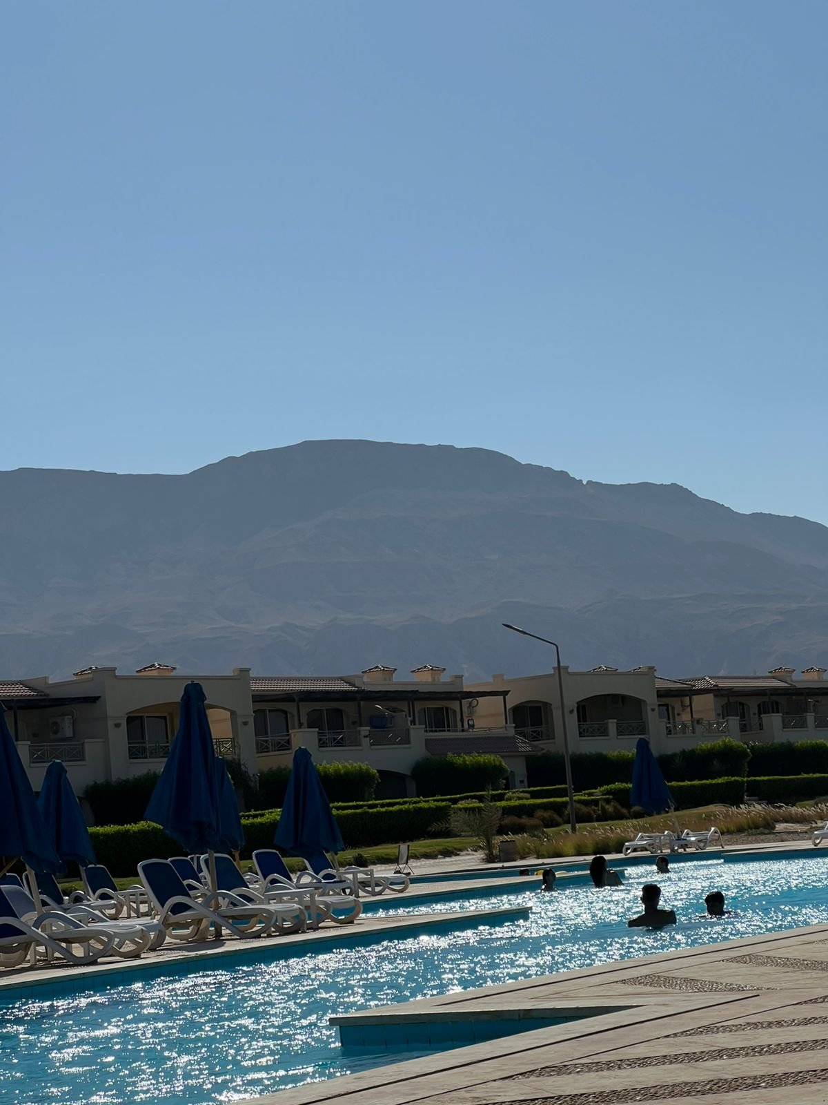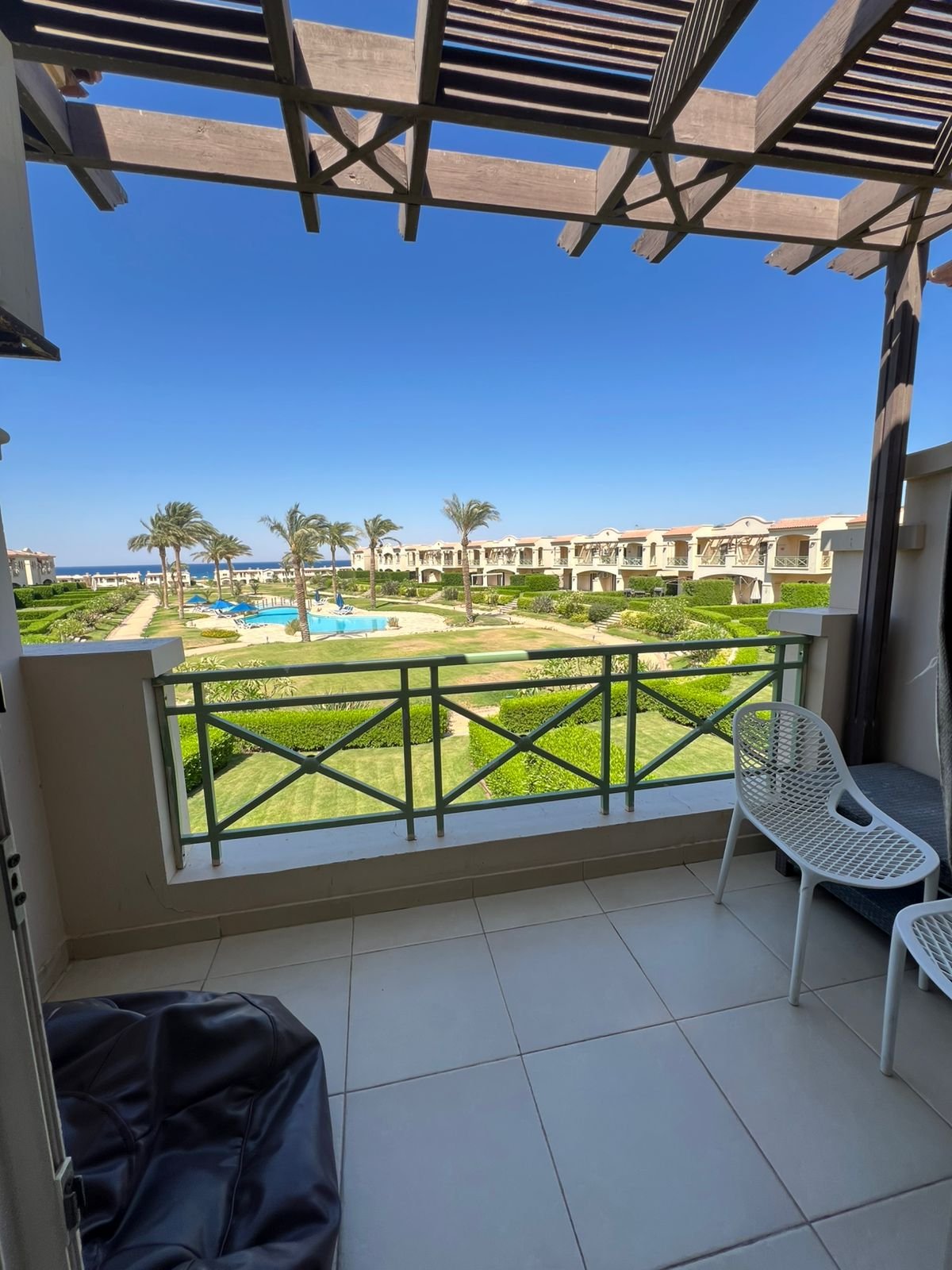 شاليه دور اول علوي مصطبه تانية للبحر ٣ غرف نوم مكيفة ٢ حمام مكيف و مجهز بالكامل الفيو على البيسين مباشرة